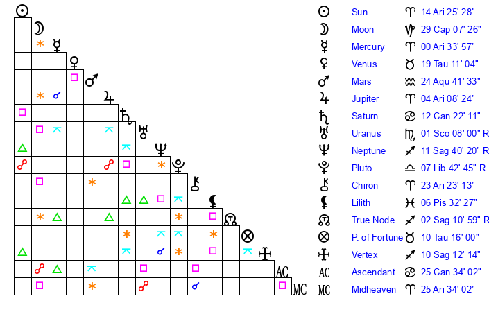 Sun | 13 Aries 52 | 14 Aries 45 | 2 Gemini 29 |