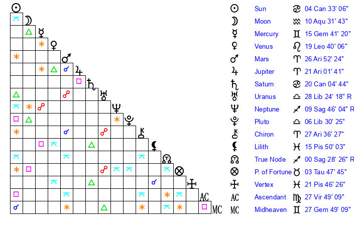 | Moon | 4 Aquarius 3 | 16 Cancer 7 | 6 Sagittarius 23 |