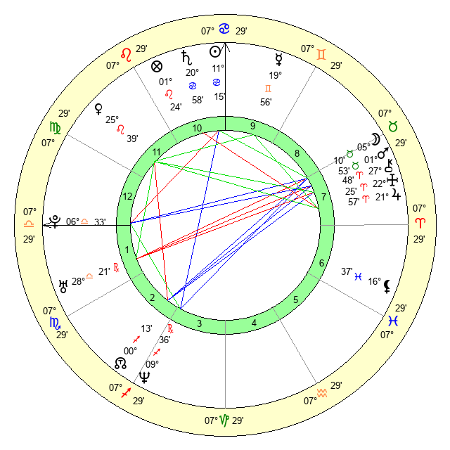 | Sun | 10 Cancer 43 | 11 Cancer 36 | 28 Leo 33 |