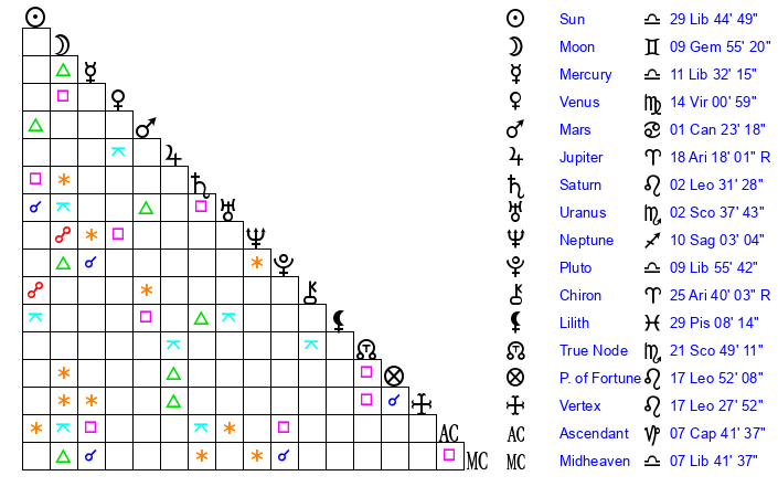 | Moon | 3 Gemini 29 | 19 Scorpio 15 | 7 Aries 40 |