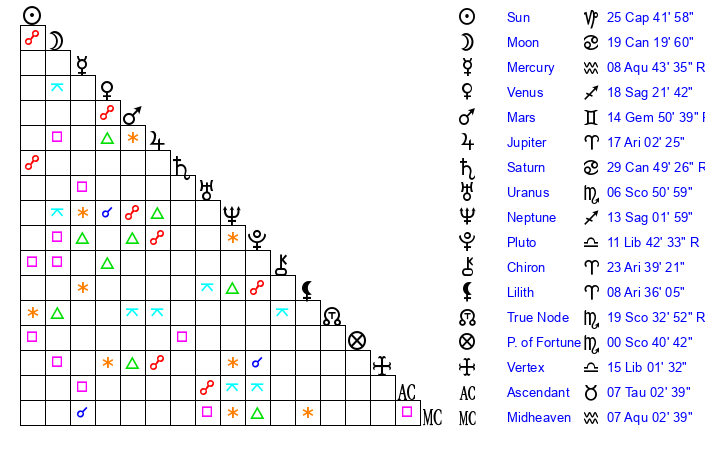 | Mercury | 8 Aquarius 54 | 11 Capricorn 29 | 23 Aquarius 30 |