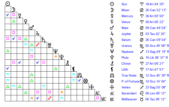 | Sun | 18 Aries 33 | 18 Aries 41 | 6 Gemini 5 |