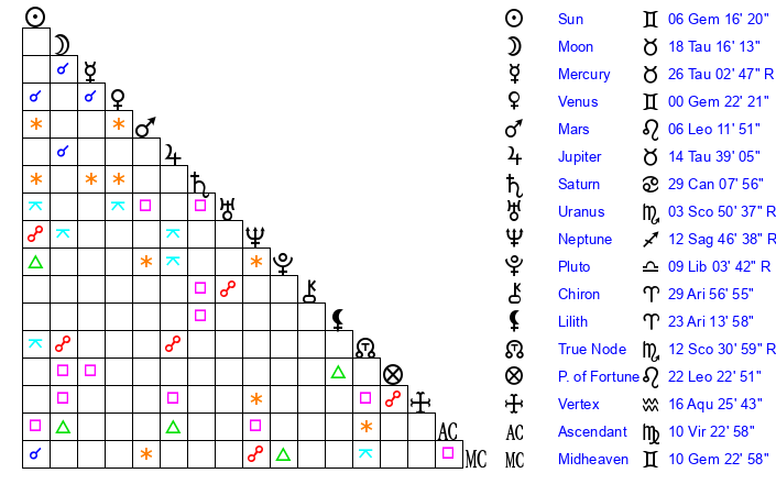 | Jupiter | 14 Taurus 31 | 26 Gemini 57 | 24 Taurus 39 |