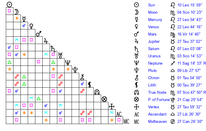 | Mars | 16 Virgo 8 | 27 Virgo 5 | 17 Libra 34 |