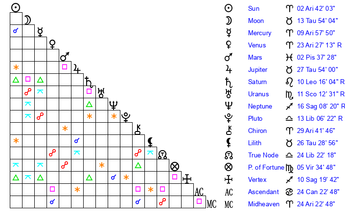 | Venus | 23 Aries 31 | 2 Aries 32 | 11 Aries 12 |