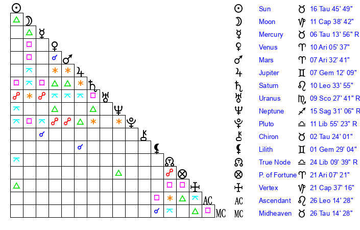 | Sun | 16 Taurus 35 | 16 Taurus 58 | 2 Cancer 38 |