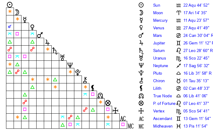 | Sun | 22 Aquarius 11 | 22 Aquarius 47 | 9 Aries 12 |