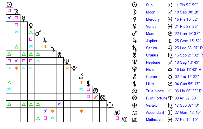 | Sun | 11 Pisces 19 | 11 Pisces 55 | 27 Aries 52 |