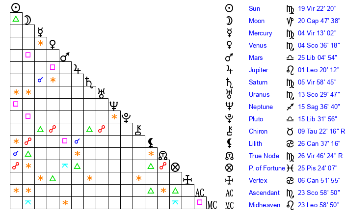 | Saturn | 6 Virgo 18 | 29 Pisces 5 | 11 Virgo 32 |