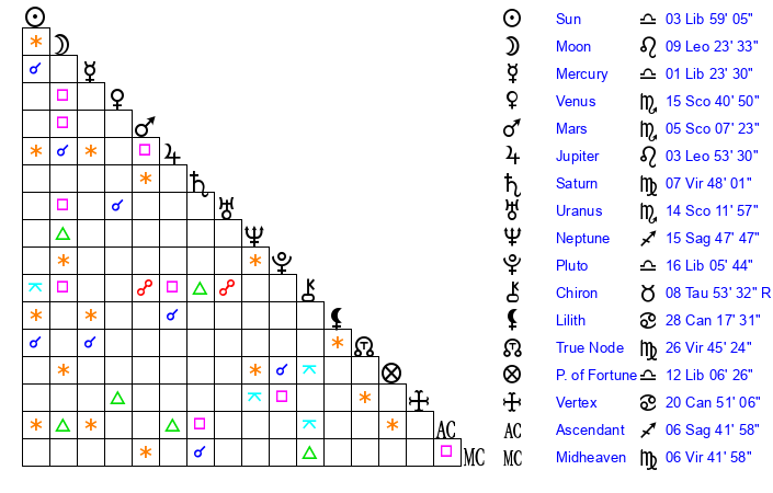 | Venus | 15 Scorpio 33 | 9 Virgo 29 | 11 Scorpio 56 |