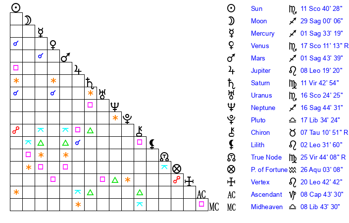 | Sun | 11 Scorpio 29 | 12 Scorpio 5 | 29 Sagittarius 2 |