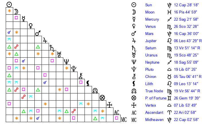 | Venus | 26 Scorpio 22 | 12 Capricorn 4 | 15 Capricorn 37 |