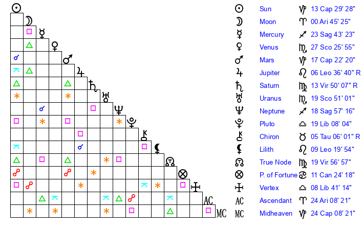 | Venus | 27 Scorpio 16 | 13 Capricorn 19 | 16 Capricorn 46 |