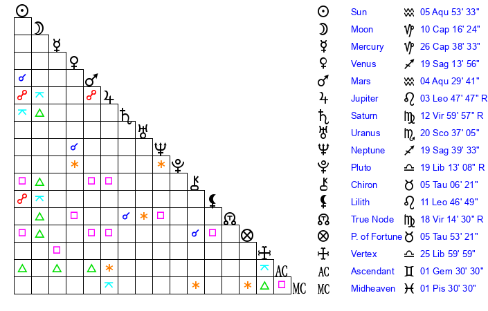 | Sun | 5 Aquarius 42 | 6 Aquarius 33 | 22 Pisces 5 |
