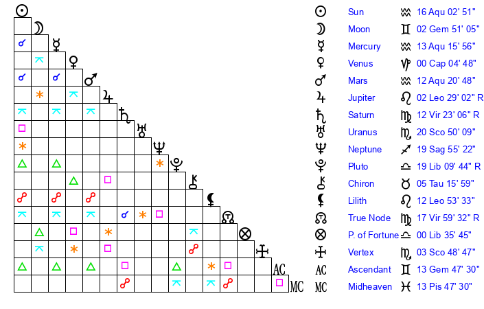| Mercury | 12 Aquarius 57 | 13 Aquarius 37 | 4 Aries 28 |
