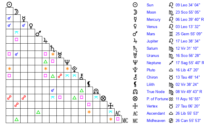 | Moon | 21 Scorpio 20 | 18 Scorpio 20 | 9 Leo 0 |