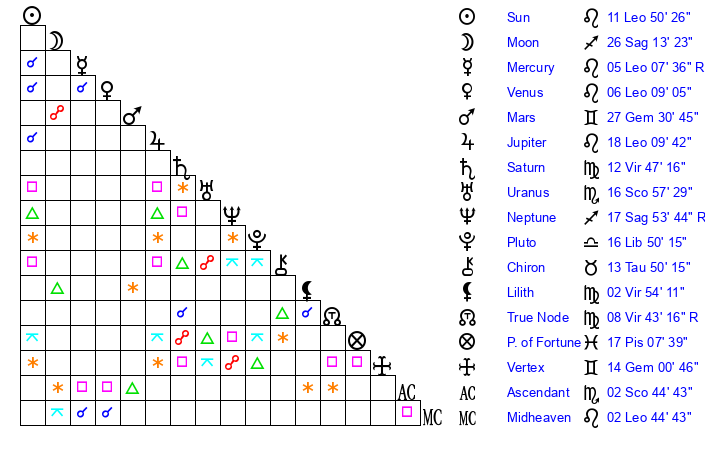 | Moon | 18 Sagittarius 14 | 12 Sagittarius 15 | 2 Virgo 36 |