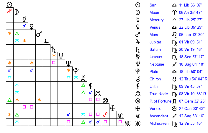 | Moon | 3 Aries 48 | 16 Pisces 34 | 3 Sagittarius 36 |