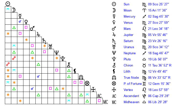 | Sun | 9 Scorpio 14 | 10 Scorpio 5 | 25 Sagittarius 44 |