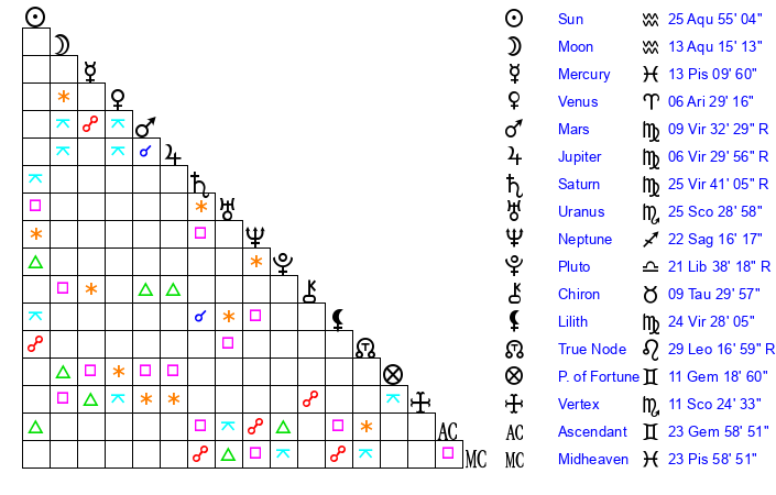 | Moon | 10 Aquarius 29 | 27 Virgo 15 | 6 Libra 42 |