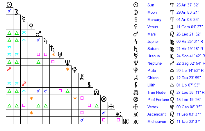 | Sun | 25 Aries 27 | 25 Aries 33 | 9 Gemini 0 |
