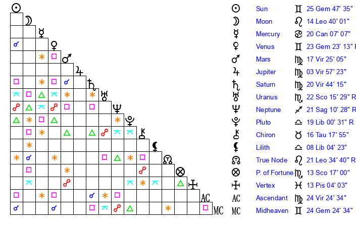 | Sun | 25 Gemini 16 | 25 Gemini 23 | 8 Leo 12 |