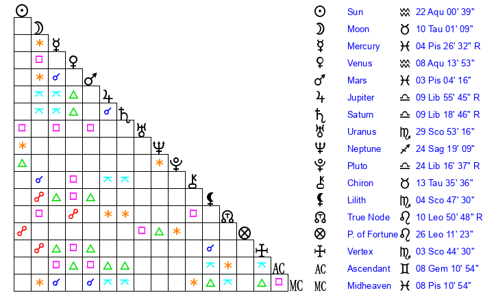 | Mercury | 4 Pisces 38 | 22 Aquarius 22 | 9 Pisces 58 |