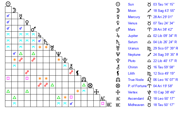 | Uranus | 29 Scorpio 11 | 25 Taurus 54 | 27 Scorpio 25 |