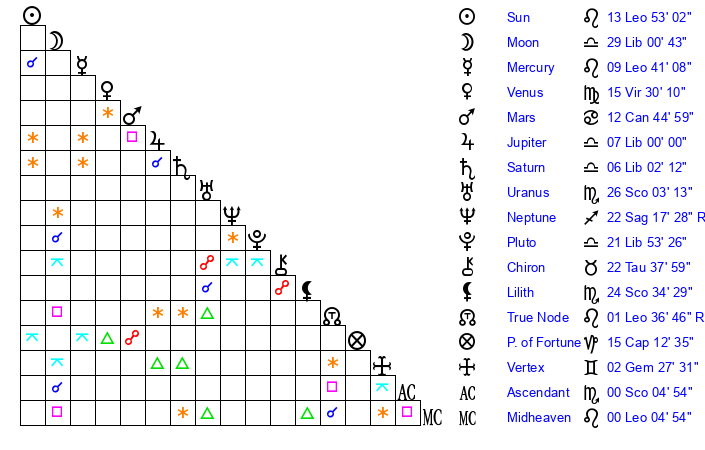 | Moon | 26 Libra 54 | 7 Capricorn 1 | 5 Gemini 31 |