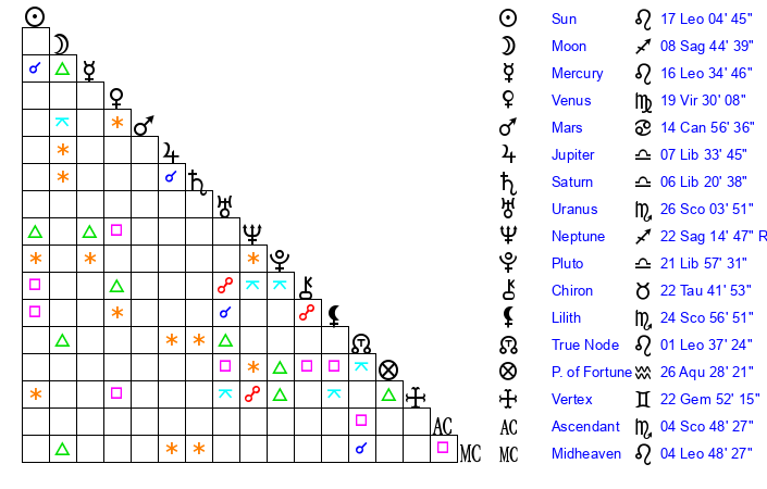 | Venus | 18 Virgo 53 | 10 Cancer 36 | 10 Scorpio 51 |