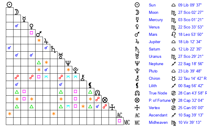| Sun | 8 Libra 59 | 9 Libra 19 | 22 Scorpio 49 |