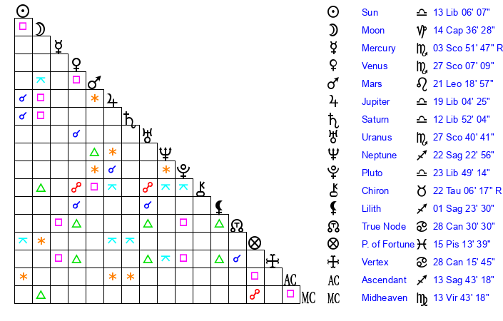| Saturn | 13 Libra 12 | 27 Pisces 15 | 18 Libra 21 |