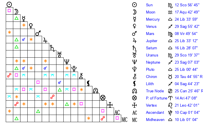 | Sun | 12 Scorpio 45 | 13 Scorpio 5 | 27 Sagittarius 16 |
