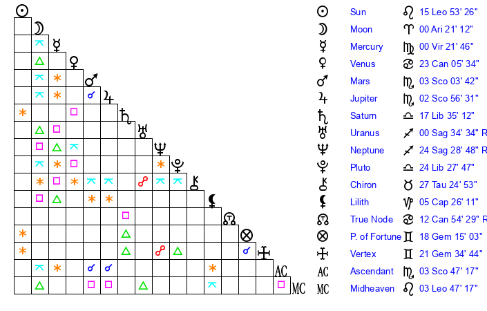 | Moon | 23 Pisces 42 | 2 Aquarius 53 | 1 Scorpio 41 |