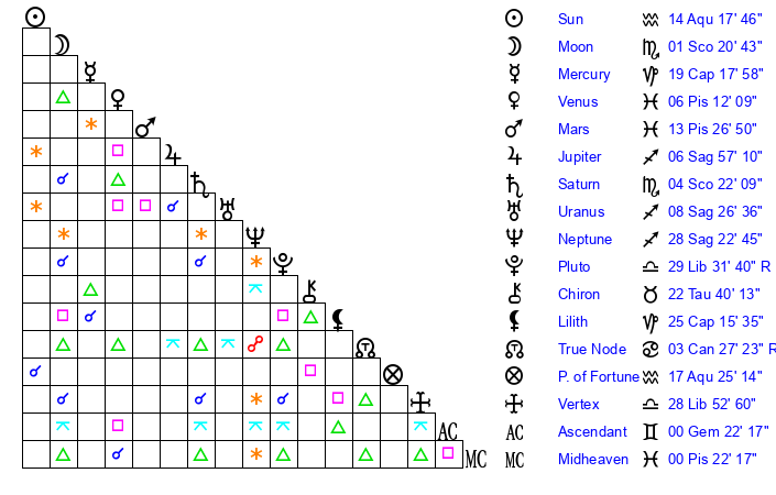 | Saturn | 4 Scorpio 43 | 17 Pisces 36 | 3 Scorpio 55 |