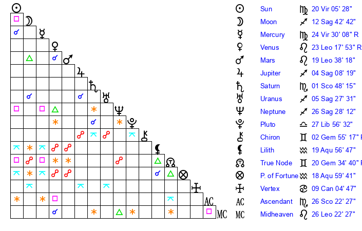 | Mercury | 24 Virgo 41 | 20 Virgo 34 | 27 Libra 41 |