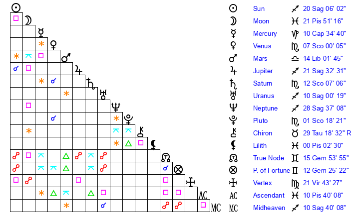 Saturn | 12 Scorpio 23 | 13 Pisces 15 | 15 Scorpio 45 |