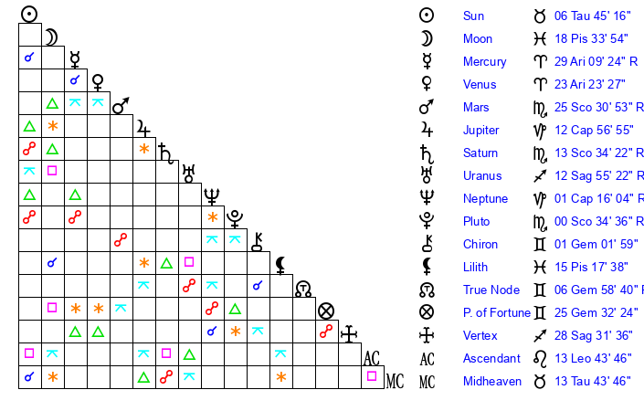 | Sun | 6 Taurus 13 | 6 Taurus 17 | 15 Gemini 44 |