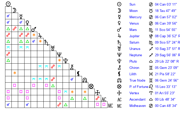 | Moon | 16 Taurus 22 | 1 Cancer 40 | 27 Scorpio 47 |