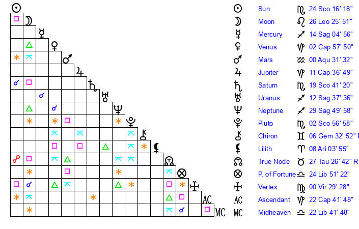 | Saturn | 19 Scorpio 57 | 25 Pisces 11 | 24 Scorpio 33 |