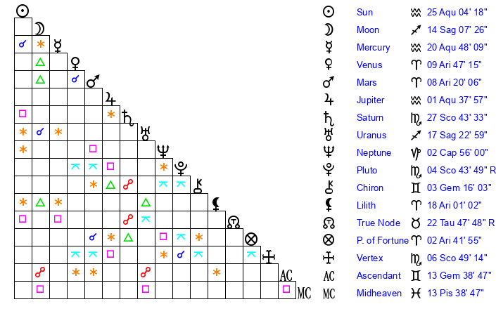 | Mercury | 19 Aquarius 50 | 27 Aquarius 45 | 18 Aries 38 |