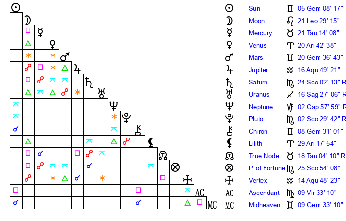 | Sun | 4 Gemini 57 | 5 Gemini 16 | 13 Cancer 11 |