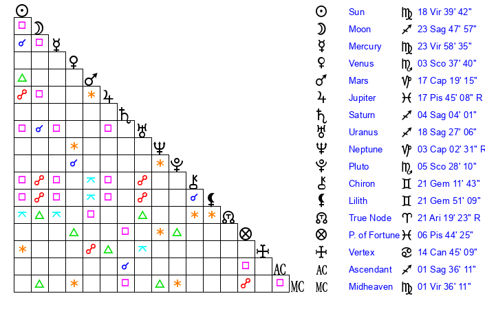 | Mercury | 23 Virgo 11 | 16 Virgo 48 | 20 Scorpio 50 |