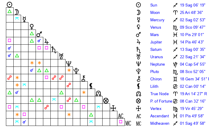 | Saturn | 13 Sagittarius 11 | 25 Pisces 13 | 17 Sagittarius 30 |