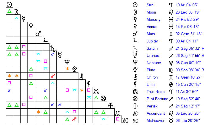 | Moon | 21 Leo 13 | 8 Virgo 31 | 17 Capricorn 4 |