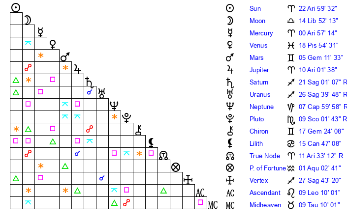 | Moon | 12 Libra 24 | 26 Libra 16 | 13 Pisces 48 |