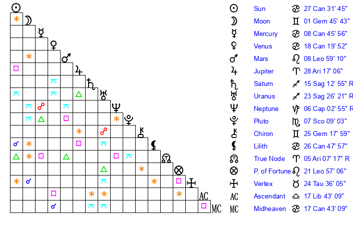 | Jupiter | 28 Aries 19 | 9 Cancer 10 | 29 Aries 44 |