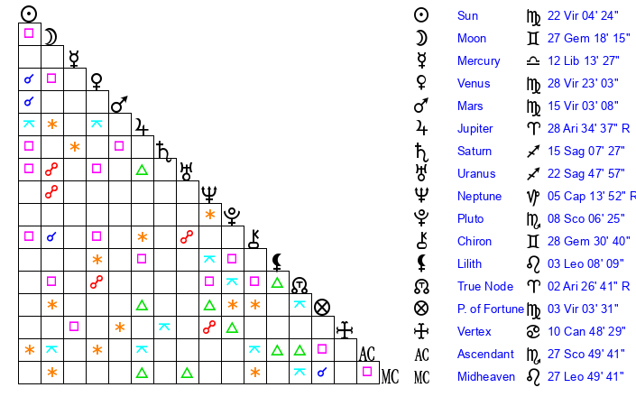 | Venus | 28 Virgo 9 | 24 Leo 49 | 15 Scorpio 27 |