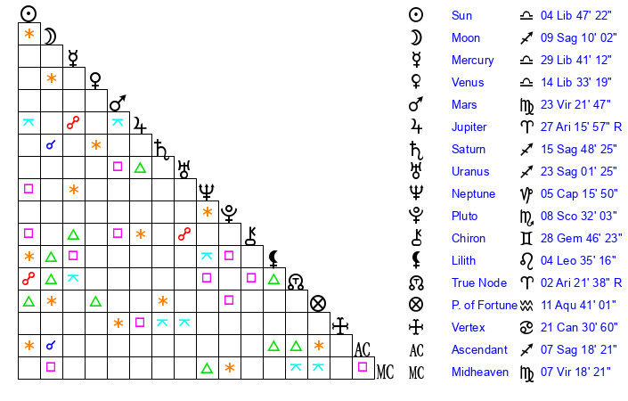 | Saturn | 15 Sagittarius 59 | 27 Pisces 51 | 19 Sagittarius 9 |