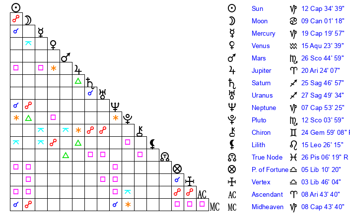 | Venus | 14 Aquarius 48 | 12 Capricorn 4 | 0 Aries 52 |
